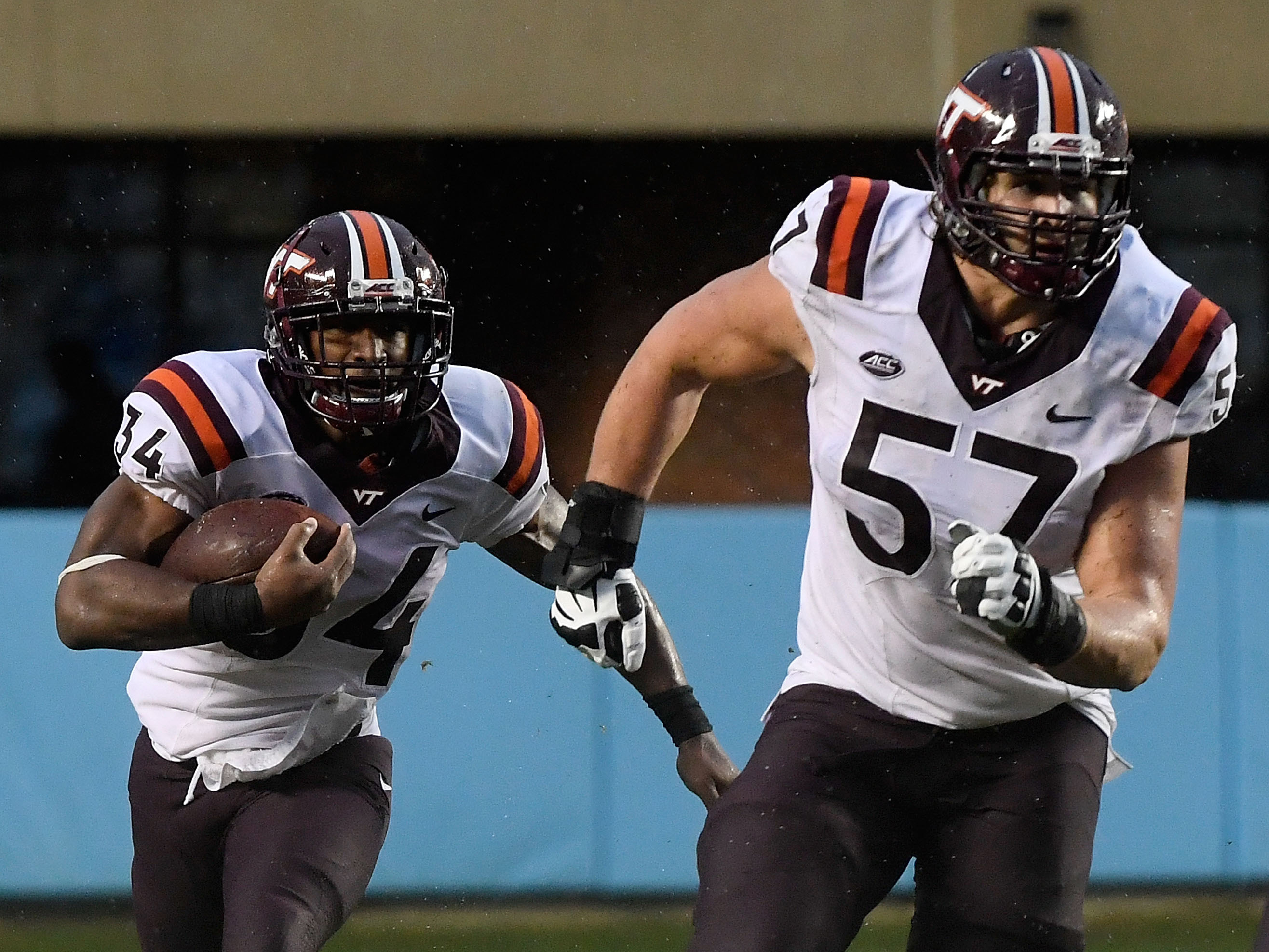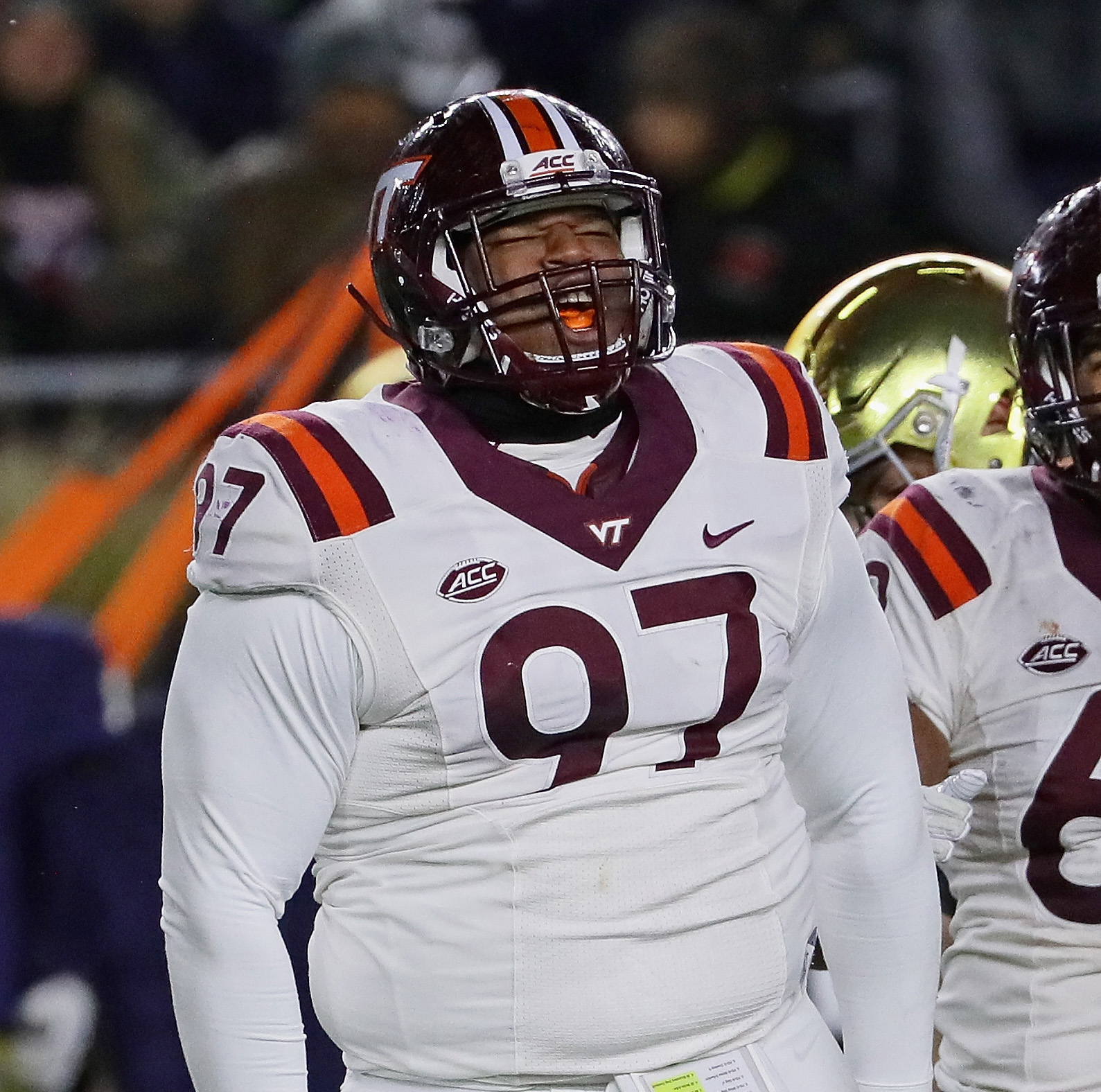 PFF's Austin Gayle displays the pass-rushing prowess on the inside of Virginia Tech interior defender Tim Settle.