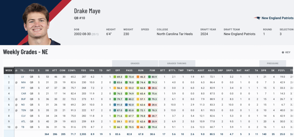In his sophomore season, Maye is fourth in PFF passing grade (82.8), sixth in overall PFF grade (83.6), fourth in adjusted completion percentage (80.5%) and fifth in WAR. His breakout has coincided with the 8-2 Patriots leading the AFC East by two games and boasting a 93% chance to reach the postseason.