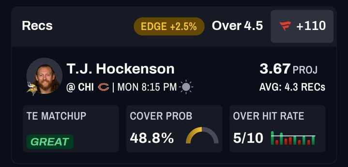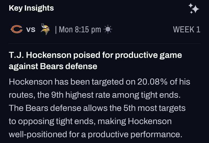 Chicago had trouble defending tight ends down the stretch last season, setting the stage for Hockenson to make a significant impact in Week 1. Over the Bears’ final five games, two tight ends recorded at least five receptions against them, while three others finished just one shy with four catches. With Jordan Addison sidelined, Hockenson could be in line for a heavy target share out of the gate.