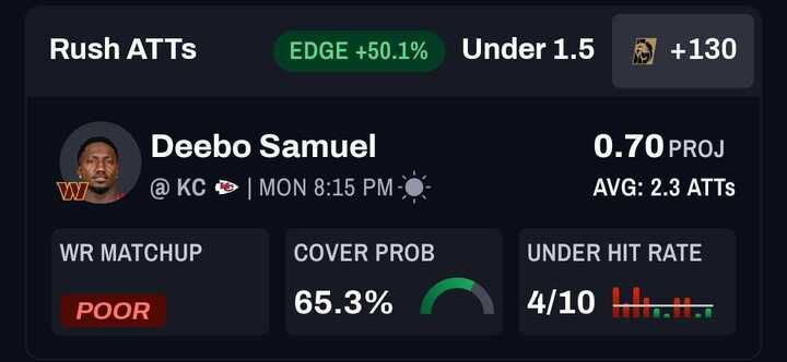WR Deebo Samuel, Washington Commanders: Under 1.5 rush attempts (+130)