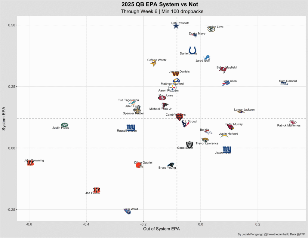 While the effect isn’t massive, Michael Penix Jr. has been notably better when operating in structure — above average in-system, but below average when forced off script.