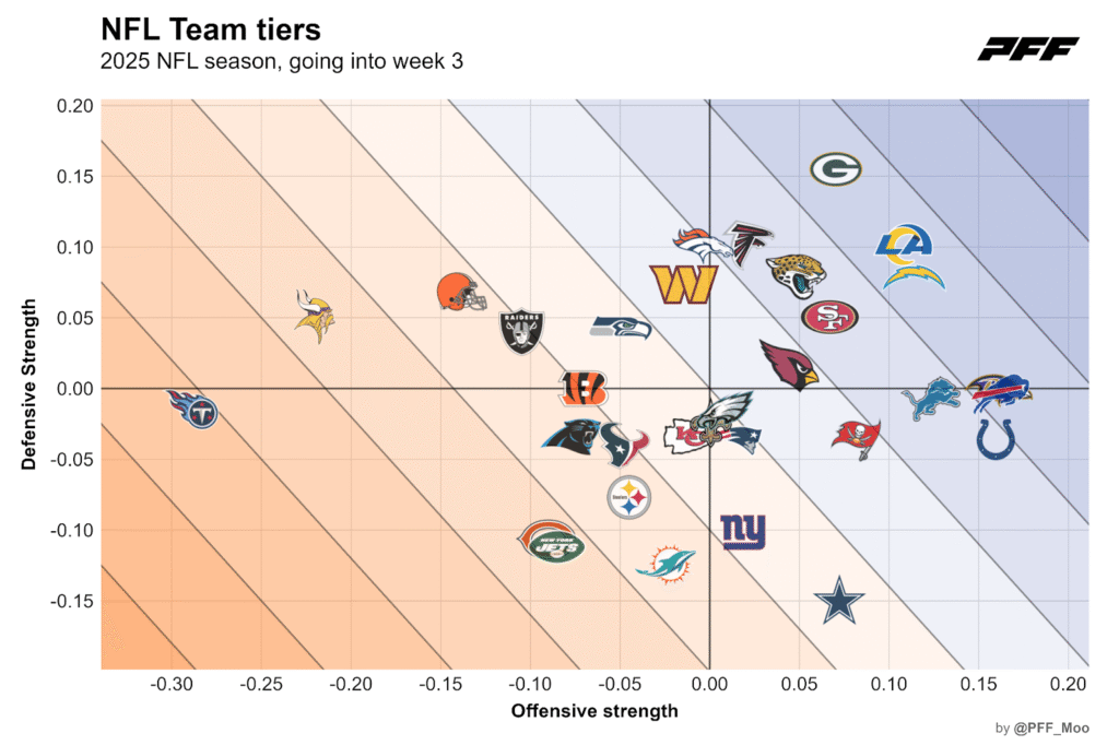 As always, we’ll start with team fundamentals to set the stage for our analysis. The chart below from PFF's Timo Riske offers one perspective, but whichever metric you choose to measure team performance through two weeks, the story remains the same.