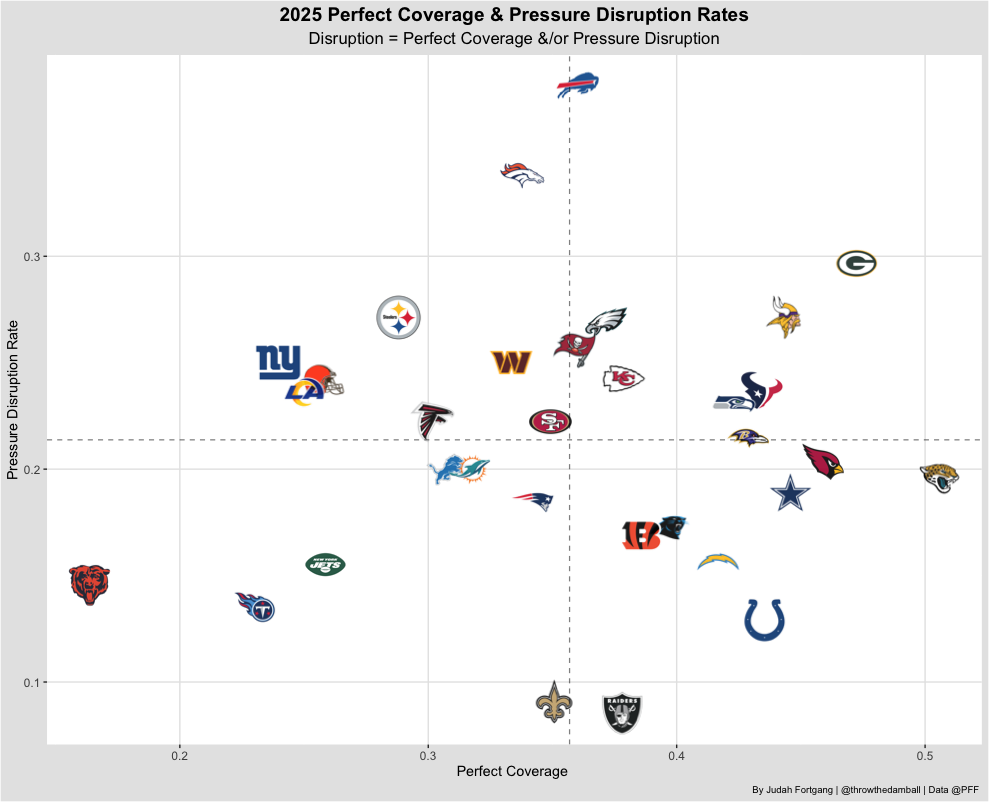 The chart above illustrates how much disruption a defense creates — whether through “perfect coverage” or by generating pressure that prevents quarterbacks from progressing through their reads. The Bears rank dead last in disruption and grade poorly in both categories. And the situation is only getting worse: with Jaylon Johnson sidelined, they’re now starting three cornerbacks, none of whom have posted a single-season PFF grade above 60.0.