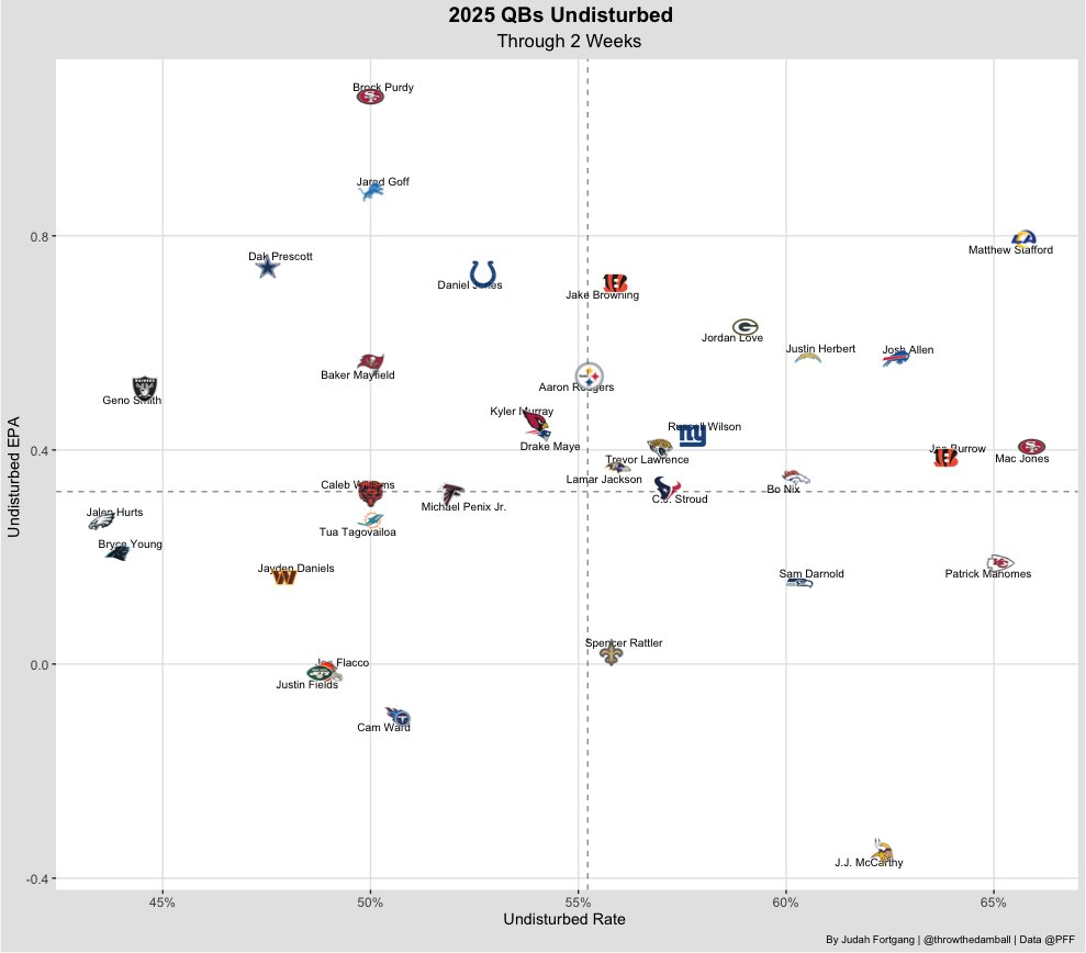 While the sample is still small, Prescott has been dominant when kept clean, and he should see more undisturbed dropbacks in this matchup than he did over the first two weeks. At a clip of 0.8 EPA per clean play, even three to four additional undisturbed snaps could swing the outcome.