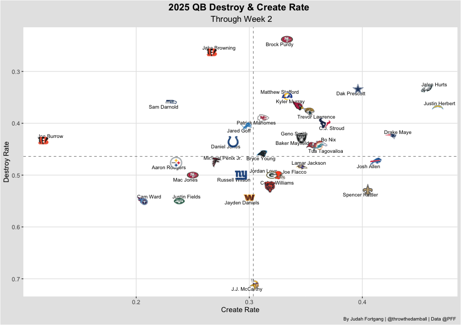The chart below illustrates the rate at which quarterbacks create plays versus how often they destroy them.