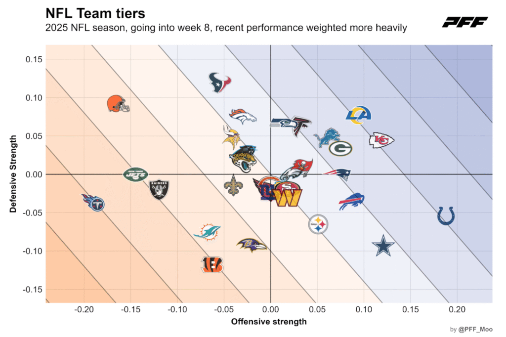 Here is a handy chart, courtesy of Timo Riske, illustrating team performance. Choose your preferred metric, and it likely tells the same story: the Cowboys profile as a dominant offense with a struggling defense, while the Broncos feature a solid defense and a below-average offense.
