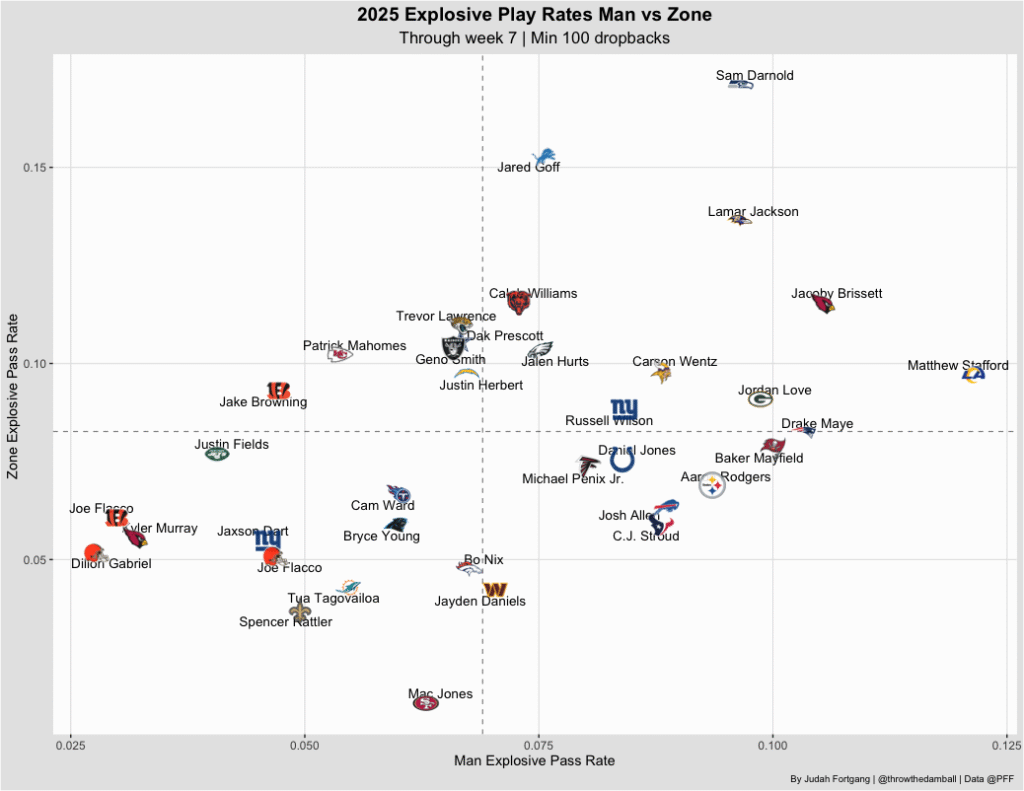 On the other side of the ball, the Cowboys’ defensive matchup may not be as unfavorable as it appears when accounting for the Broncos’ offensive tendencies. Nearly all of Bo Nix’s production this season has come against man coverage, where he ranks ninth in EPA per play. Against zone, however, that number drops to 24th in the league — and the Cowboys lead the NFL in zone-coverage rate so far this season.