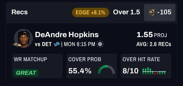 WR DeAndre Hopkins, Baltimore Ravens: Over 1.5 receptions (-105)