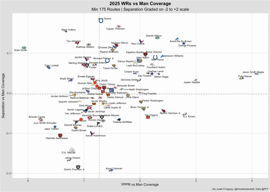 And in this matchup, the Lions have two of the most dominant man-coverage receivers in the league. Jameson Williams and Amon-Ra St. Brown both rank near the top of the NFL in yards per route run and separation against man, giving Detroit a clear edge when defenses line up in single coverage.
