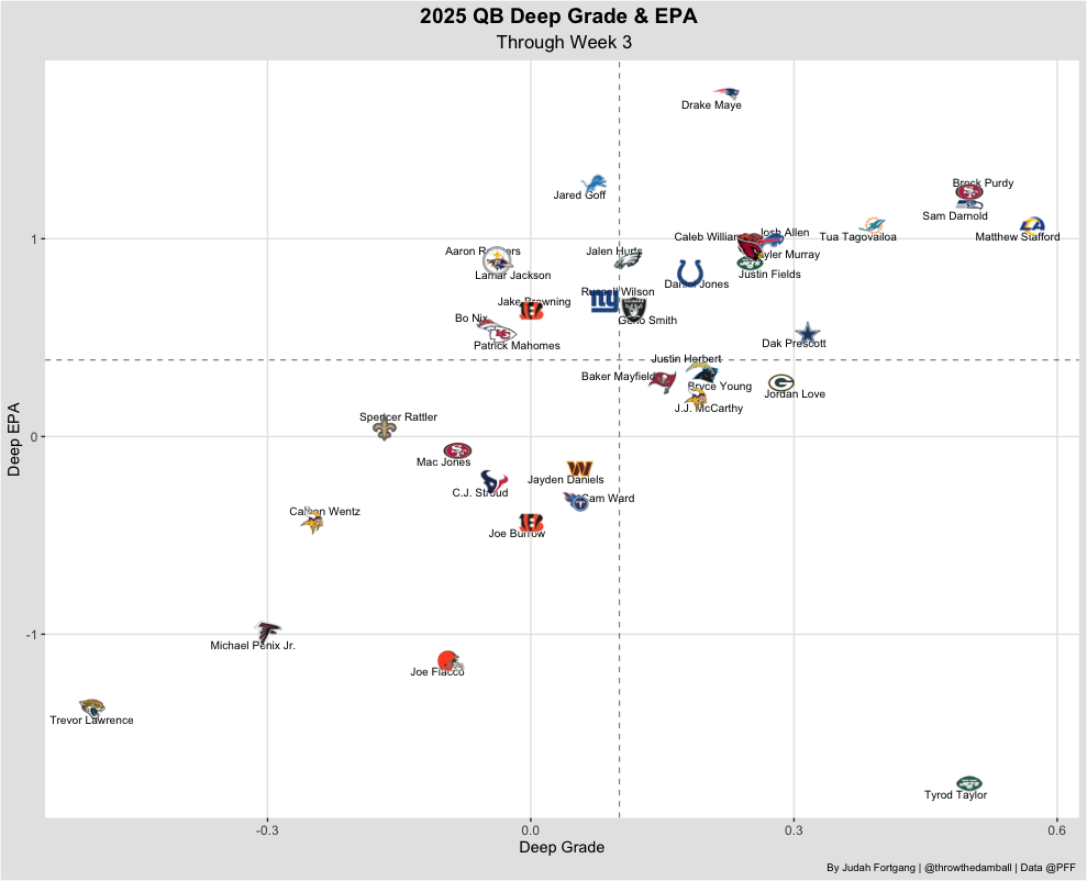 While the overall results have been average, Young ranks 11th in deep-passing grade this season — a continuation of his promising stretch to close last year.