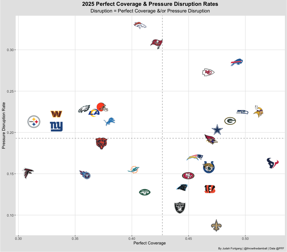 The Jets defense has struggled to create disruption this season, posting the lowest overall disruption rate in the NFL at just 35.5%. They’ve been among the league’s worst in generating pressure and in producing perfect coverage.
