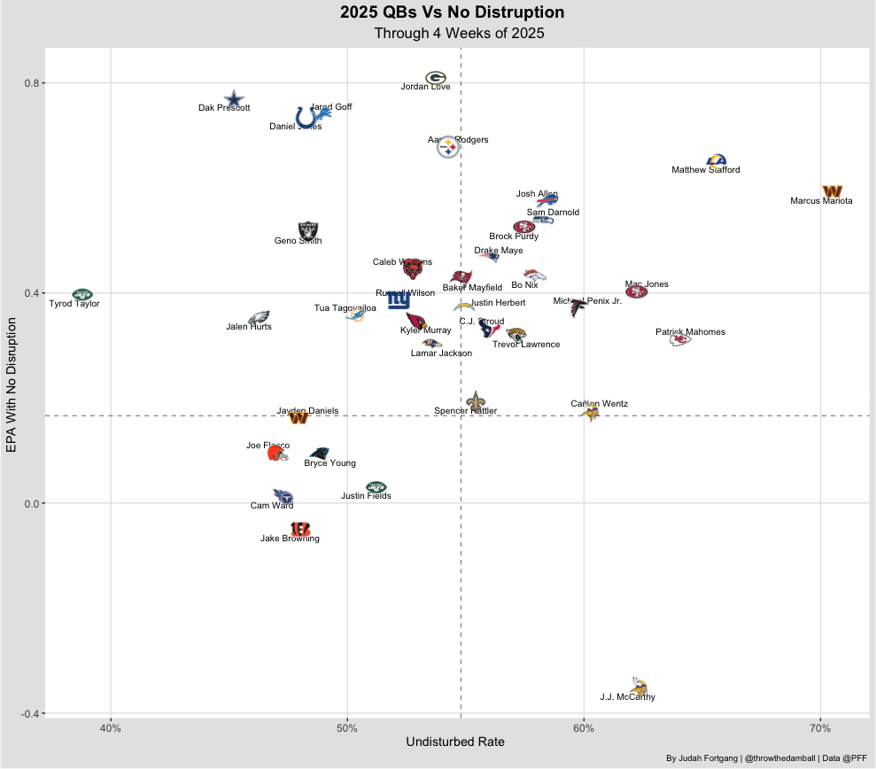 While Dak Prescott has faced consistent pressure behind a struggling offensive line, he’s been highly effective when kept clean—ranking second only to Jordan Love in EPA per play from a clean pocket. Against a Jets defense that ranks last in explosive play rate allowed, Prescott is well-positioned for a big day in this matchup.