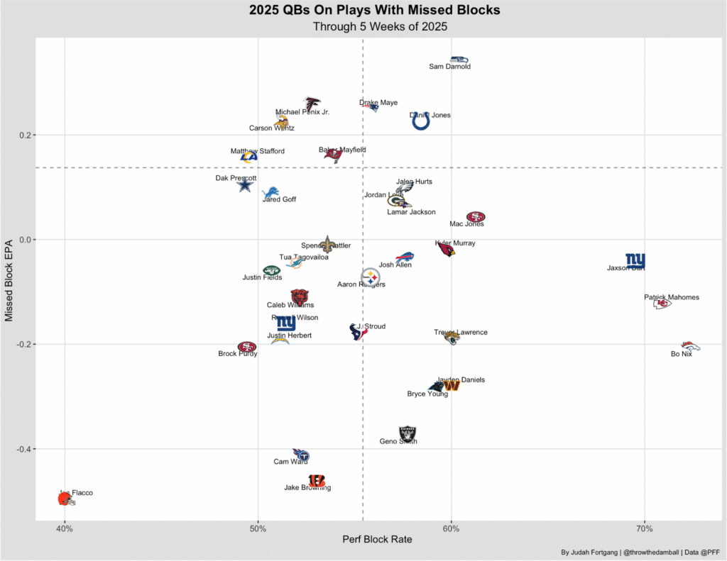 When Herbert has been forced to operate behind poor blocking, the results have been rough — he’s posted some of the league’s worst EPA numbers on plays with a blocking breakdown.