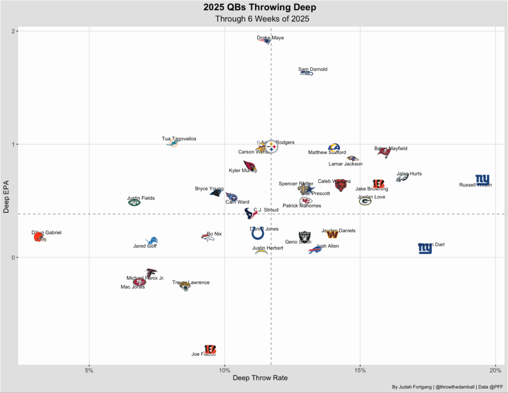 As we highlighted last week, Baker Mayfield has thrived throwing deep this season — ranking near the top in deep attempt rate and overall efficiency, trailing only standouts like Sam Darnold and Drake Maye in success.