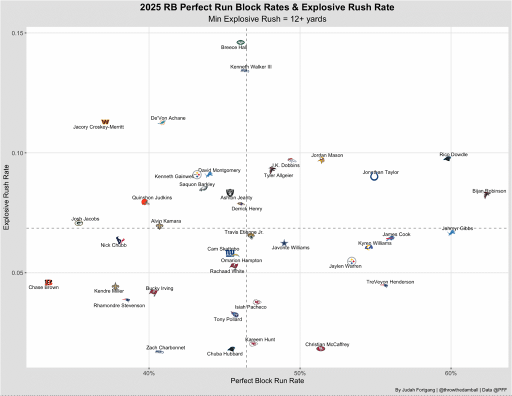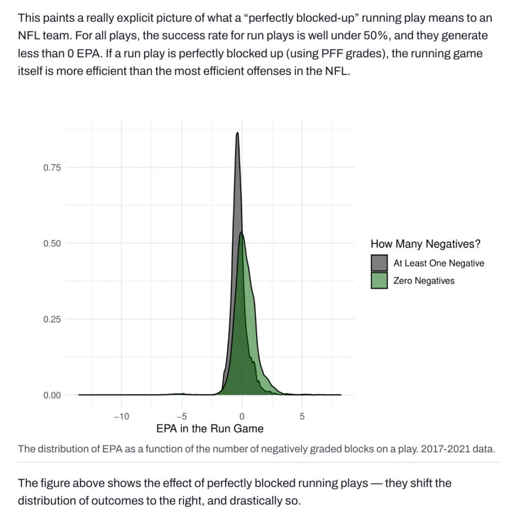 A late 2021 PFF study revealed the significant impact of perfectly blocked run plays on rushing success.