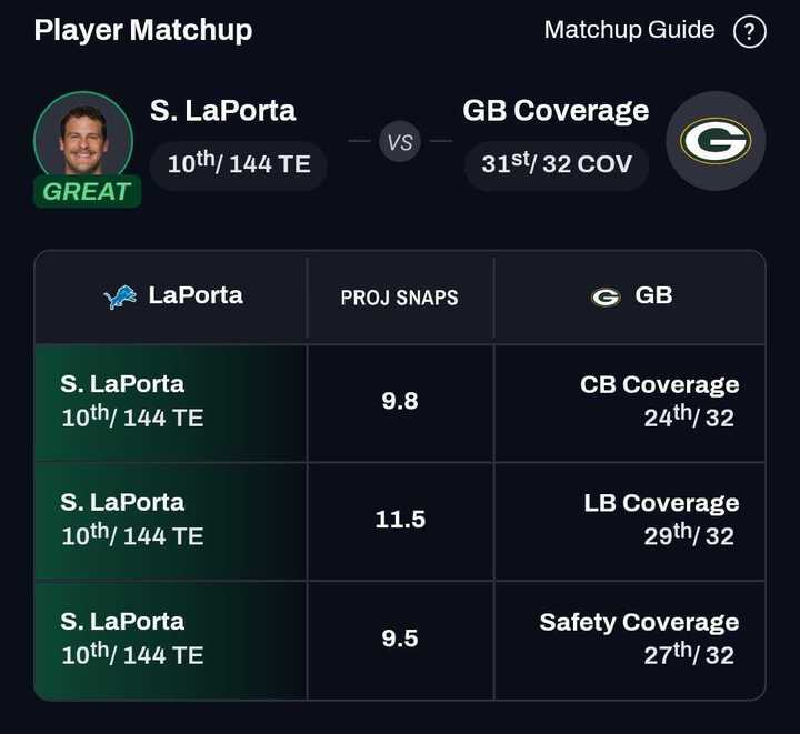 - Sam LaPorta is still a strong target without Ben Johnson calling plays: LaPorta faces a plus matchup against Green Bay’s coverage unit, particularly when it comes to Packers linebacker Quay Walker, who struggled to a 50.6 PFF coverage grade last season.