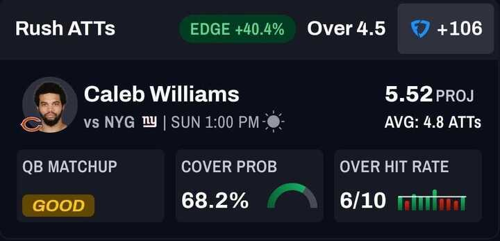 QB Caleb Williams, Chicago Bears: Over 4.5 rushing attempts (+106)