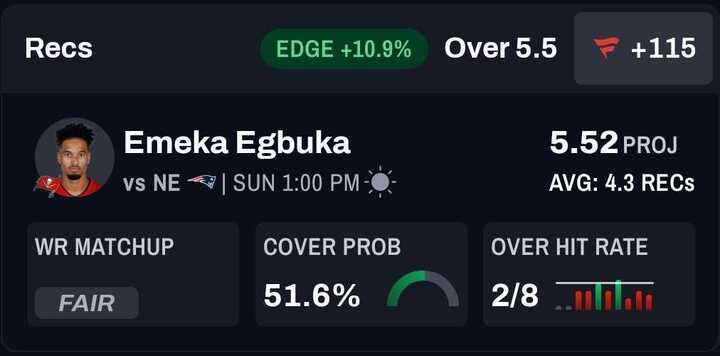 WR Emeka Egbuka, Tampa Bay Buccaneers: Over 5.5 receptions (+115)
