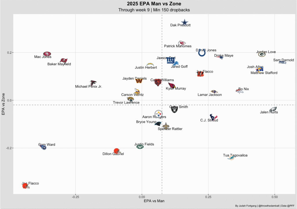 While Justin Fields has struggled against zone coverage, he’s been near league average versus man, producing roughly 0.2 EPA per play more than he does against zone.