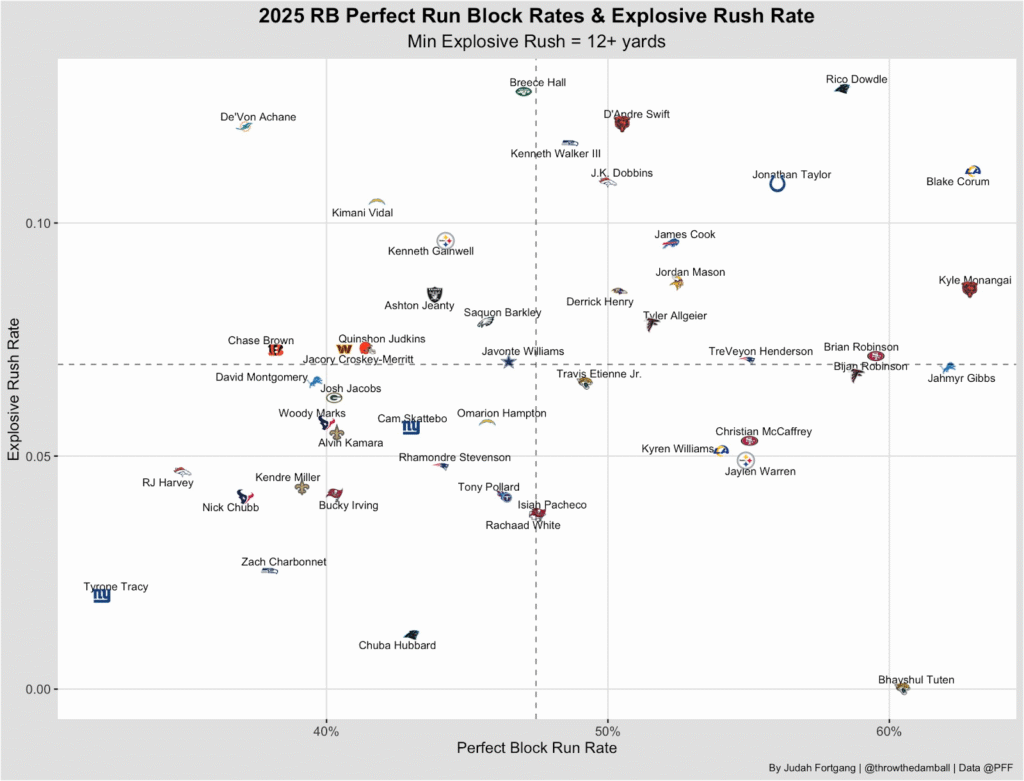 Now he draws a matchup with a Giants defense that ranks among the league’s worst at forcing blocking mistakes and sits last in both rush success rate and EPA allowed per rush. With D’Andre Swift nursing an injury and the workload already tilting toward Monangai, this sets up as a breakout spot — a chance for him to fully take over the Bears’ backfield in a dream matchup.