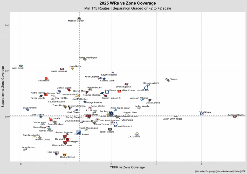 As a result, while Olave’s separation numbers have been uncharacteristically average, he’s still been one of the league’s most productive receivers against zone coverage. With Rashid Shaheed traded and additional targets opening up, Olave is also likely to take over the downfield role — an area where teams have consistently attacked the Panthers, who have allowed an average depth of target two yards higher over the past three weeks than in the previous six.