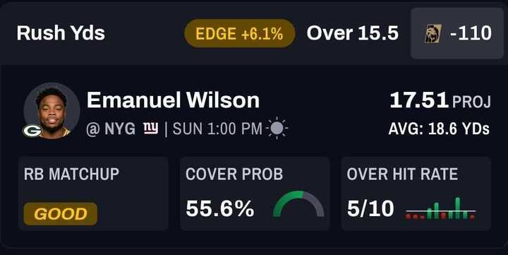 RB Emanuel Wilson, Green Bay Packers: Over 15.5 rushing yards (-110)
