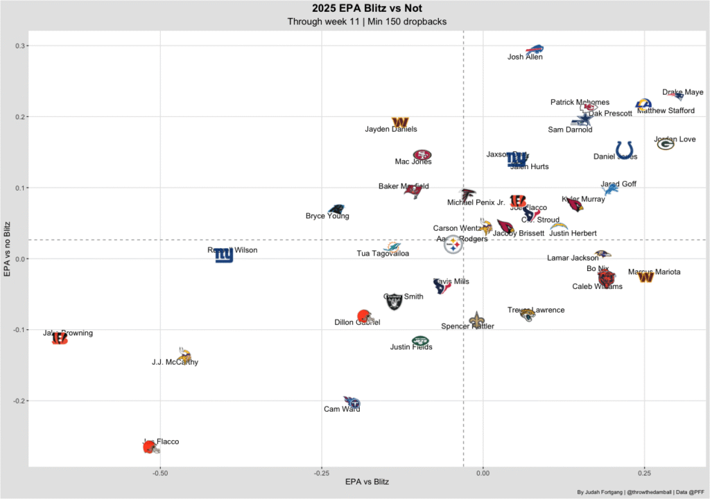 Fortunately for Love, he has been outstanding against the blitz, trailing only Drake Maye in EPA per play against five or more rushers. And because blitzing naturally introduces more variance, the baseline explosive-pass rate jumps by nearly 20%, creating even more opportunity for downfield production.