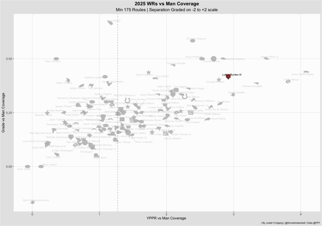 This is an area where Luther Burden has thrived, posting the fifth-most yards per route run and earning a dominant grade against man coverage, strong indicators that his production is anything but a fluke.