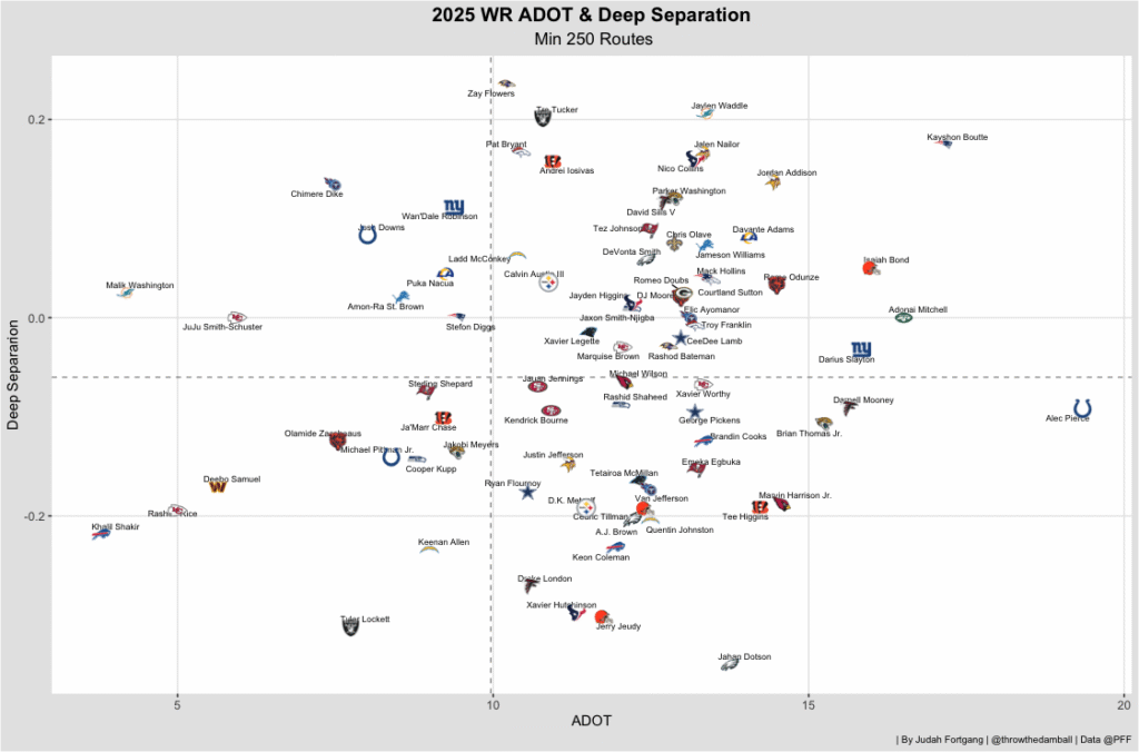 Washington has been one of the NFL’s most effective wide receivers versus man coverage, backed by strong underlying grades and a robust 2.8 yards per route run against man. With a healthy 13-yard average depth of target, he should also see opportunities downfield as Jacksonville has adopted a more aggressive approach.