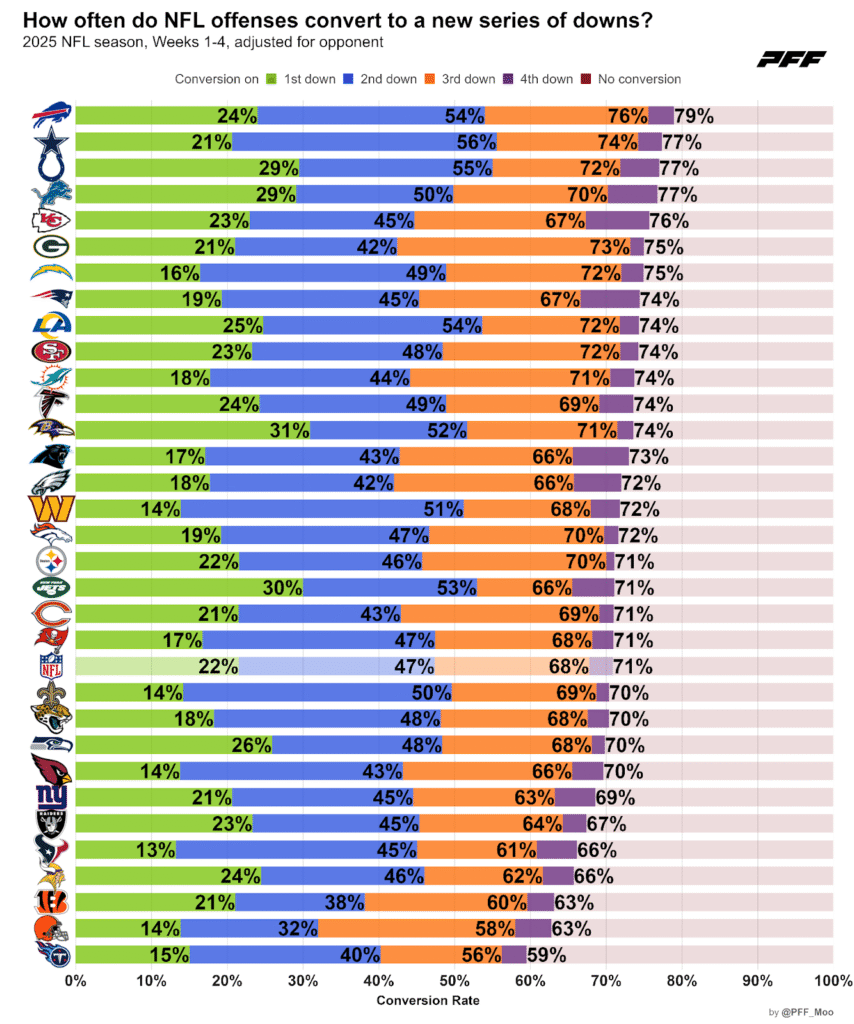 The Colts have a 77% series conversion rate — third-best in the NFL — suggesting they consistently move the ball into opponent territory. Once they’re in close, the offense leans on Jonathan Taylor, who ranks third in red-zone touches this season. In a matchup against a struggling Raiders defense, expect the Colts to get into scoring position frequently and rely on Taylor to finish the job.