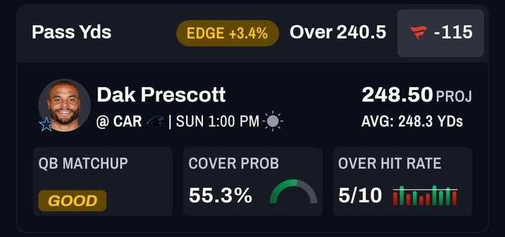 QB Dak Prescott, Dallas Cowboys: Over 240.5 passing yards (-115)