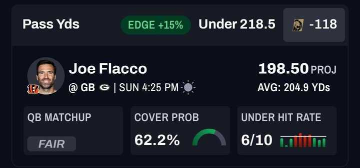 QB Joe Flacco, Cincinnati Bengals: Under 218.5 passing yards (-118)