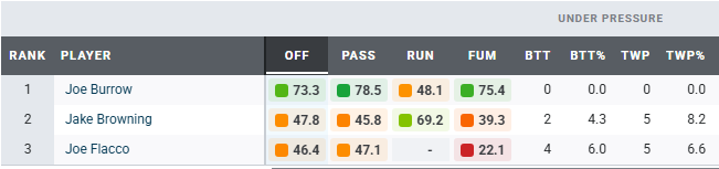 Flacco has the added disadvantage of having been battered by this same Packers defense just three weeks ago. In that Week 3 matchup, he was pressured on more than 45% of his dropbacks and knocked down 12 times, on his way to totaling just 142 passing yards.