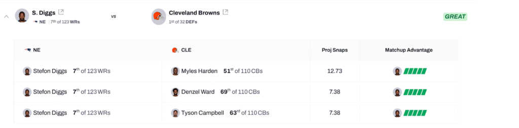 Stefon Diggs has emerged as the Patriots’ No. 1 wide receiver and owns the third-best matchup of the week, according to PFF’s Matchup Tool.