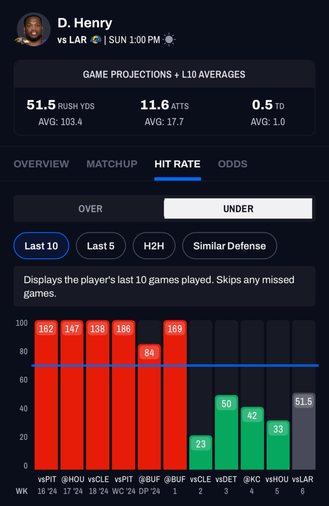 Henry hasn’t come close to this total in his past four games. Lamar Jackson’s status remains uncertain for the Ravens’ matchup with the Rams, removing the read-option threat that helps create space for Henry. The Rams rank top five in run-defense grade, yards allowed per carry and explosive run rate allowed. And if Baltimore falls behind early again, Henry may not see enough volume to make an impact.
