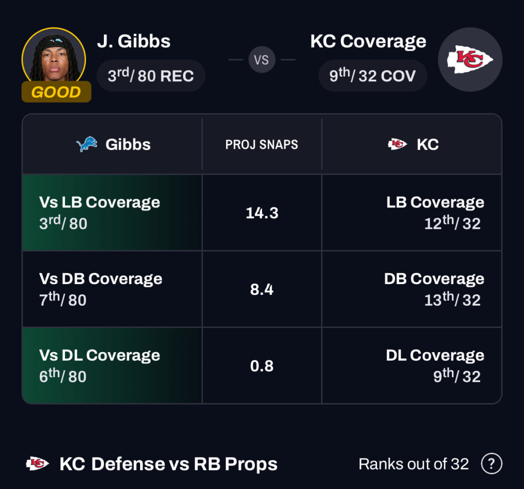 RB Jahmyr Gibbs, Detroit Lions: Over 3.5 Receptions (-143 DraftKings)