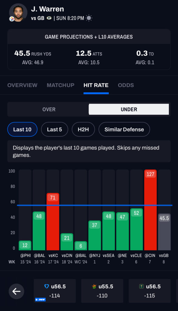 Warren has gone under this total in three of his five games this season. With fellow running back Kenneth Gainwell remaining a key part of the Steelers’ backfield rotation — and with a potential game script that could lead to more passing if Pittsburgh falls behind against a top-10 scoring team — the under on rushing attempts for Warren appears to hold value.