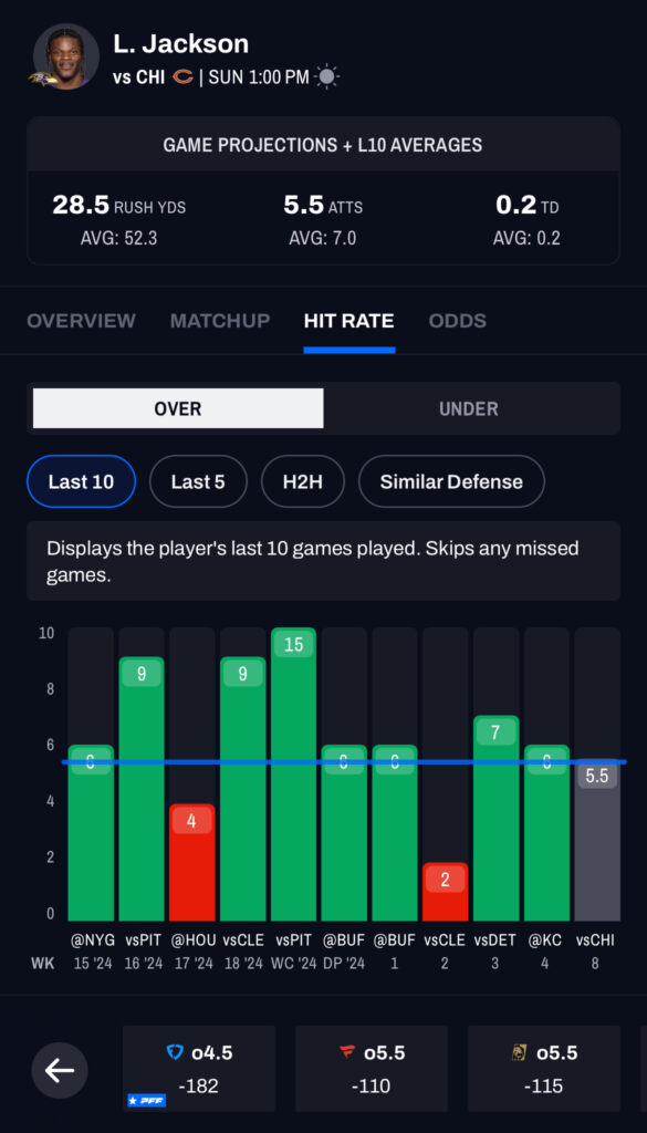 The two-time MVP appears on track to return this week against the Bears after missing the past two games with a hamstring injury. While the injury could limit Jackson’s mobility, the over on his rushing attempts remains a viable play. He has averaged seven rushing attempts per game in his past 10 starts. A similarly talented dual-threat quarterback, Jayden Daniels, ran 10 times for 52 yards against Chicago in Week 6. With the Bears ranking seventh in team coverage grade, Jackson may once again need to make plays with his legs.