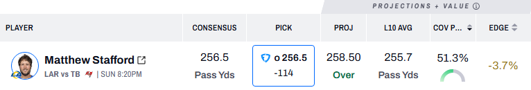 QB Matthew Stafford, Los Angeles Rams: Over 256.5 passing yards (-114)