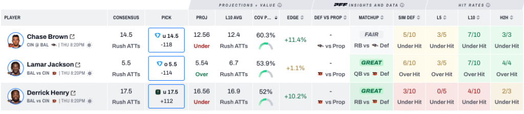 No team has run the ball less over the past two seasons than the Bengals, who sit at a league-low 31.6% rush rate. That volume shows up in Brown’s results — he has fallen under this line in seven of his 11 games this year. With Joe Burrow potentially returning and a high-powered Ravens offense on the other sideline, this shapes up as a matchup where Cincinnati may abandon the run early if it stalls.