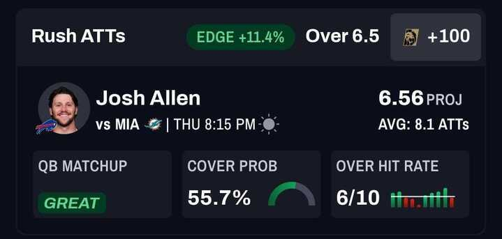 QB Josh Allen, Buffalo Bills: Over 6.5 rushing attempts (+100)