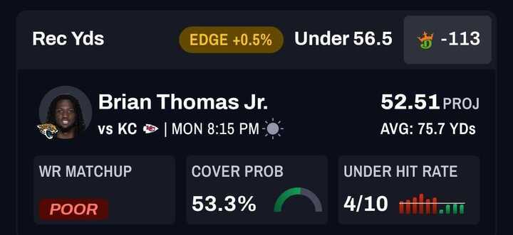 Brian Thomas Jr.’s struggles to begin the year have been well publicized, currently ranking 95th out of 114 qualifying receivers in PFF receiving grade (56.2). It hasn’t been because of lack of targets, with his 31 tied for 17th in the NFL to start the year. A combination of drops (three) and difficulties hauling in contested catches (1-for-8) have been the underlying issues in Thomas’ game. That has led to the talented receiver failing to exceed this line in all four games this season.
