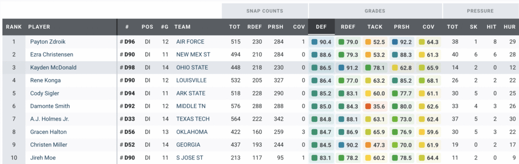 McDonald was a brick wall in the middle of Ohio State’s defensive line. The projected first-round pick led all Power Four interior defenders in PFF grade (86.5), while his 91.2 run-defense grade led the nation. McDonald recorded 34 defensive stops, which ranked second among Power Four interior defenders.