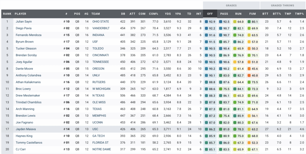 Pavia’s 92.2 PFF grade ranked second among all FBS quarterbacks, trailing only Sayin, while his 30 big-time throws tied for the most in the country. His 983 rushing yards ranked third among Power Four quarterbacks.