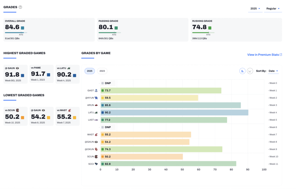 He led all FBS quarterbacks in PFF grade (92.9) and will enter his redshirt sophomore season as the top signal-caller in college football and a leading candidate to be the No. 1 overall pick in the 2027 NFL Draft.