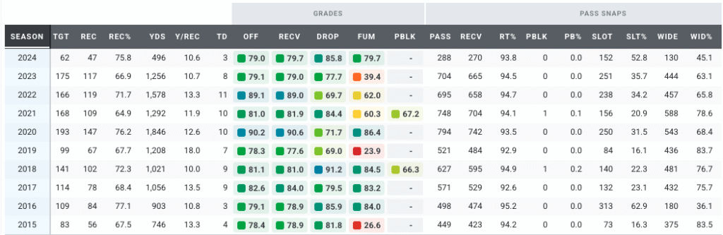 Cooper’s solid stint with the Raiders was followed by similarly productive tenures in Dallas and Cleveland. He topped 1,000 receiving yards in seven of his first nine seasons and earned an 88.7 receiving grade from 2015 to 2023. As he enters the 2025 season unsigned, Cooper remains a strong complementary option for any team.