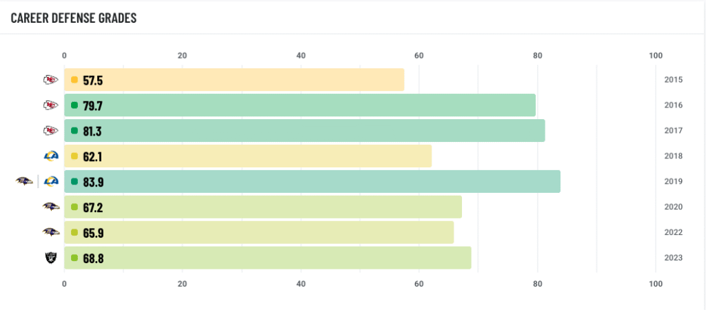 Harris’ time as an elite player was brief, but he formed a strong safety duo with Harrison Smith in Minnesota. He contributed solidly in his first three seasons as a part-time player before breaking out over the next two years. From 2018 to 2019, Harris led all qualified safeties with a 92.0 PFF grade. His following two seasons weren’t as productive, and he did not see any game action after 2021.
