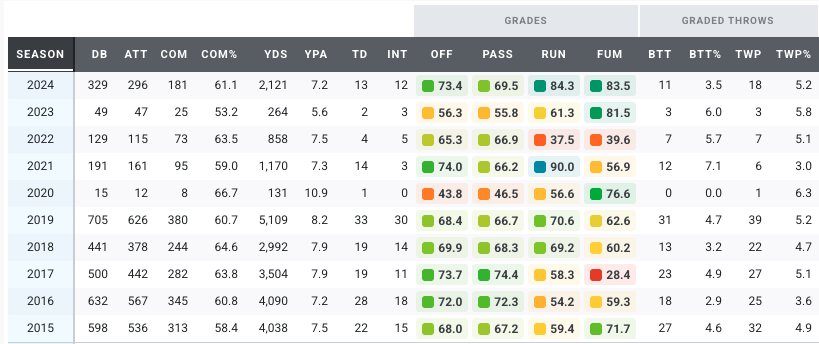 Darby is set to play for his seventh team in 2025, but he has been a productive cornerback at nearly every stop. He has posted a season-long PFF grade of at least 69.7 in five of his six previous stints. While he has only eight career interceptions, Darby has recorded an impressive 74 pass breakups over his 10-year career, including two seasons with 15 breakups.