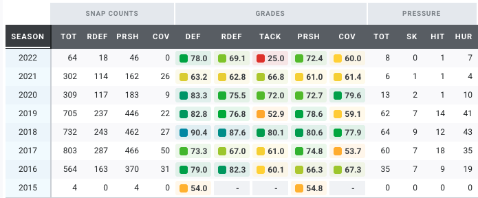 Hicks has never earned Pro Bowl recognition, but he has been a solid contributor for multiple teams over the past decade. His first four seasons in Philadelphia were his best, as he posted an elite 90.0 PFF grade during that span. His top season since then came in 2024, when he recorded a 77.4 PFF grade in Cleveland, 11th among qualified linebackers.