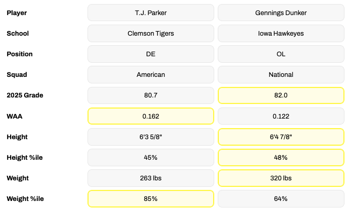- OT Gennings Dunker vs. Edge T.J. Parker: Dunker has been dominant as Iowa’s right tackle over the past two seasons, earning an elite 90.0 PFF grade over that span, highlighted by an 89.8 run-blocking mark. Parker finished the season with an 80.7 PFF grade and 41 pressures and has been consistently productive across his three years at Clemson.